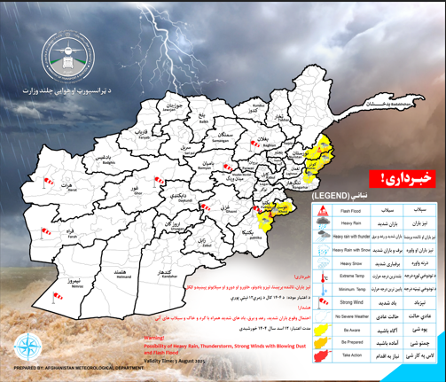 Warnings خبـرداری Last updated Aug 2, 2025 د اعتبار موده: د ۱۴۰۴ کال د زمري ۱۲ نېټې پورې په لاندې ولایتونو کې تېز باران، تالنده برېښنا، تېزو بادونو، خاورو او دوړو او سېلابونو پېښېدو اټکل: