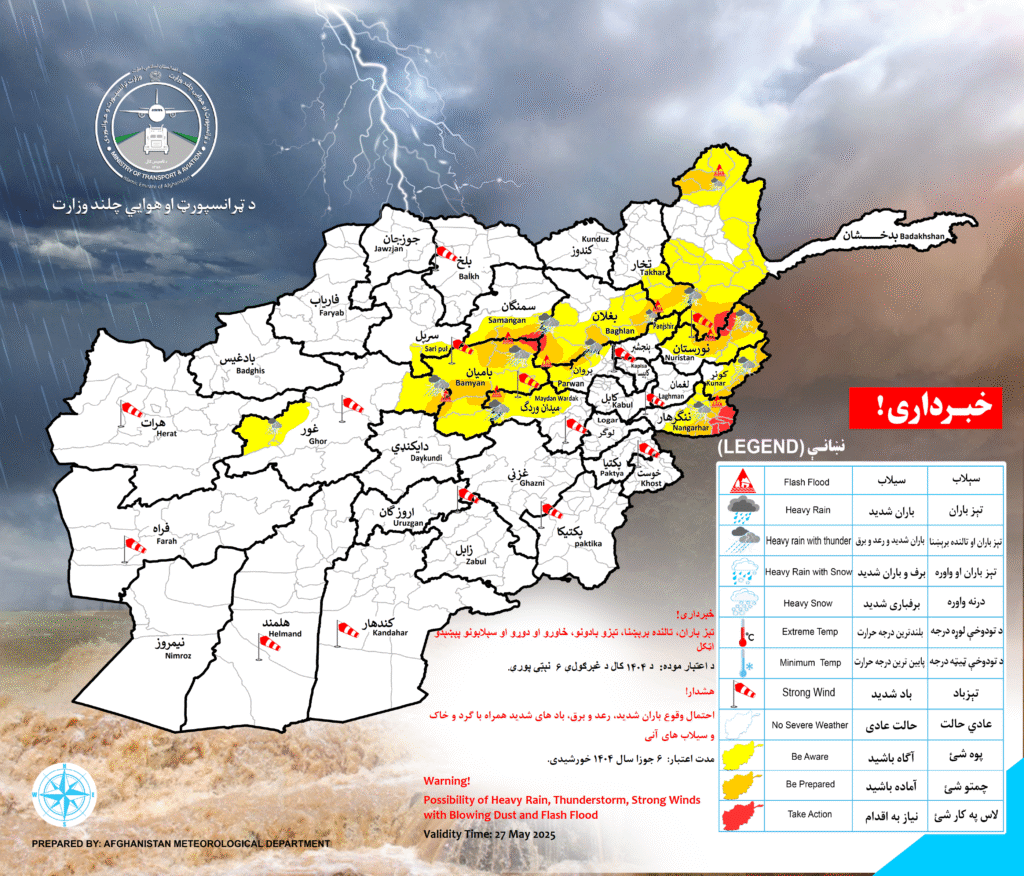 !خبـرداری Last updated May 26, 2025 د اعتبار موده: د ۱۴۰۴ کال د غبرګولې ۶ نېټې پورې په لاندې ولایتونو کې تېز باران، تالنده برېښنا، تېزو بادونو، خاورو او دوړو او سېلابونو پېښېدو اټکل