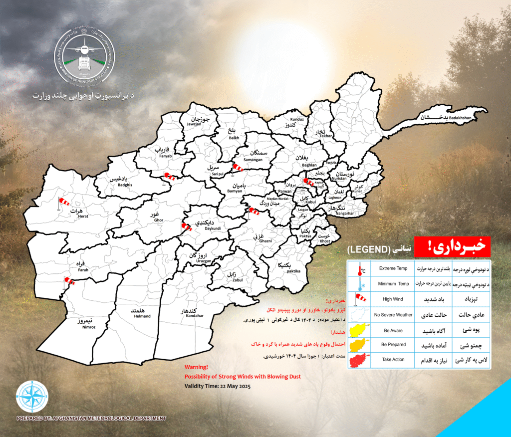 Uncategorized @fa !هشــــدار Last updated می 21, 2025 مدت اعتبار : ۱ جوزا سال ۱۴۰۴ خورشیدی احتمال وقوع باد های شدید همراه با گرد و خاک درولایات ذیل پیش بینی میگردد