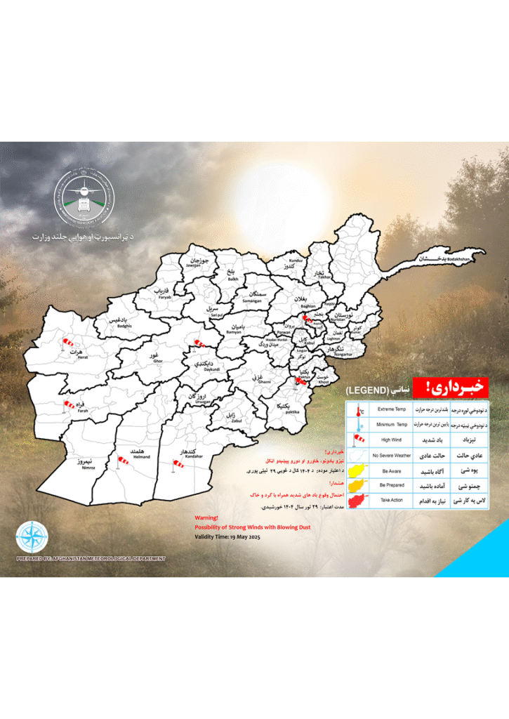 احتمال وقوع باد های شدید همراه با گرد و خاک درولایات ذیل پیش بینی میگردد