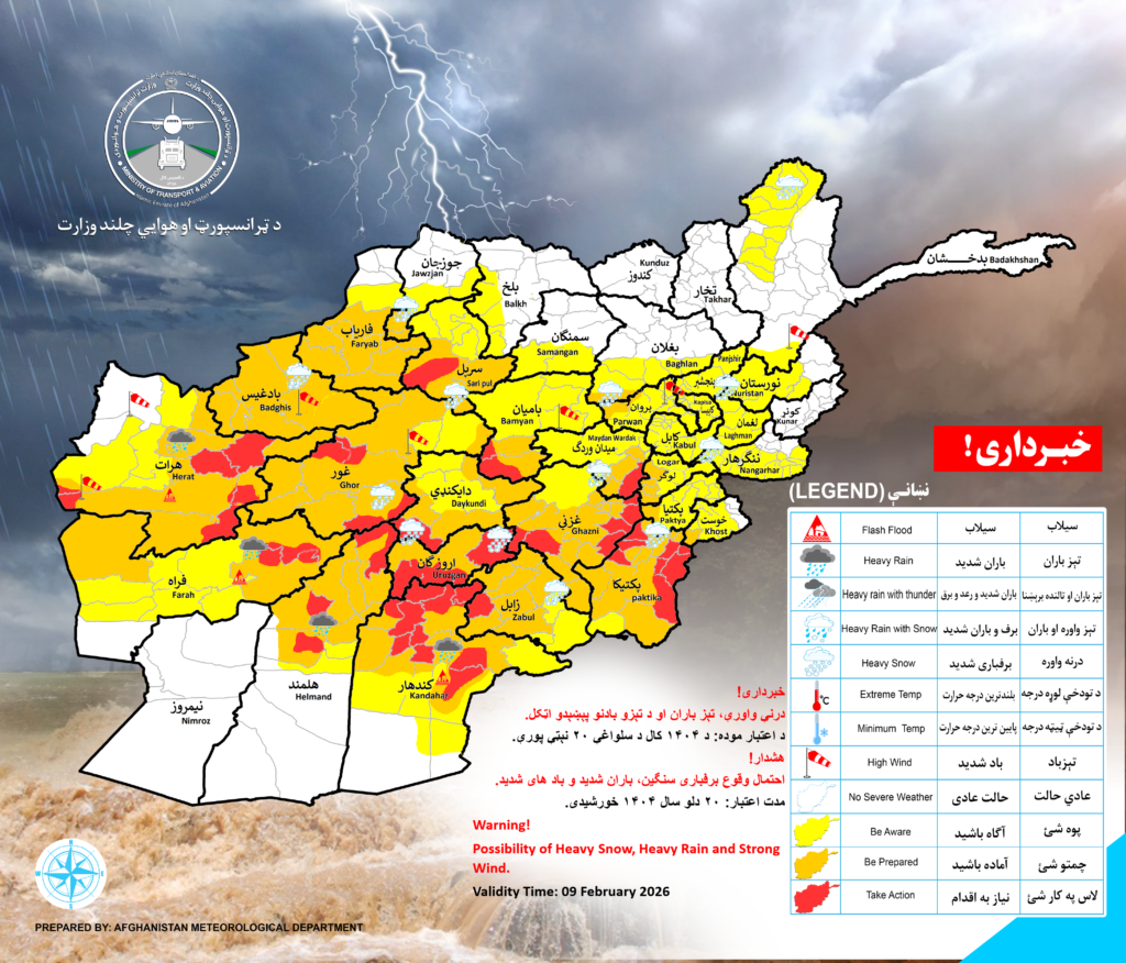 Herat, Farah, Helmand, Badghis, Ghor, Urozgan, Kandahar, Zabul, Daykundy, Faryab, Jowzjan, Balkh, Sari Pull, Samangan, Bamyan, Ghazni, Paktiya, Khost, Paktika, Logar, Maydan Wardak, Parwan, Baghlan, Panjshir, Kapisa, Kabul, Nangarhar, Laghman, Nuristan and Badakhshan Provinces including Salang’s the amount of rainfall is between (10 up to 40) mm and amount of snowfall (10 up to 50) in different area.