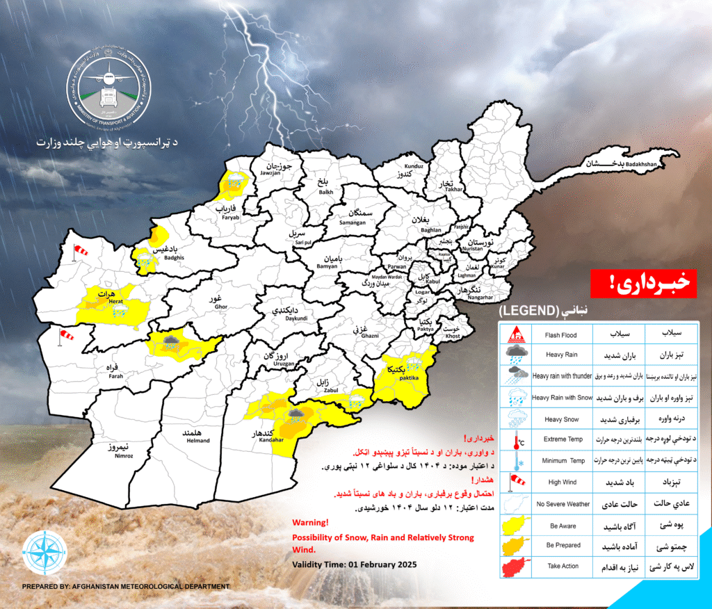 Herat, Badghis, Faryab, Farah, Kandahar, Zabul and Paktika Provinces the amount of rainfall is between (10 up to 25) mm and amount of snowfall (10 up to 20) in different area.