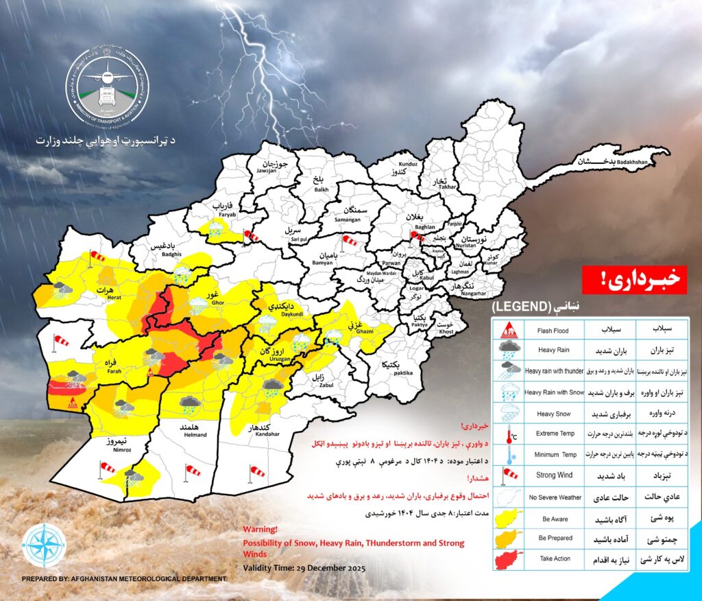 Uncategorized @fa WARNING! Last updated دیسمبر 28, 2025 Validity time: 29 December 2025 Possibility of snow, Heavy Rain, Thunderstorm and Strong winds for the following provinces:
