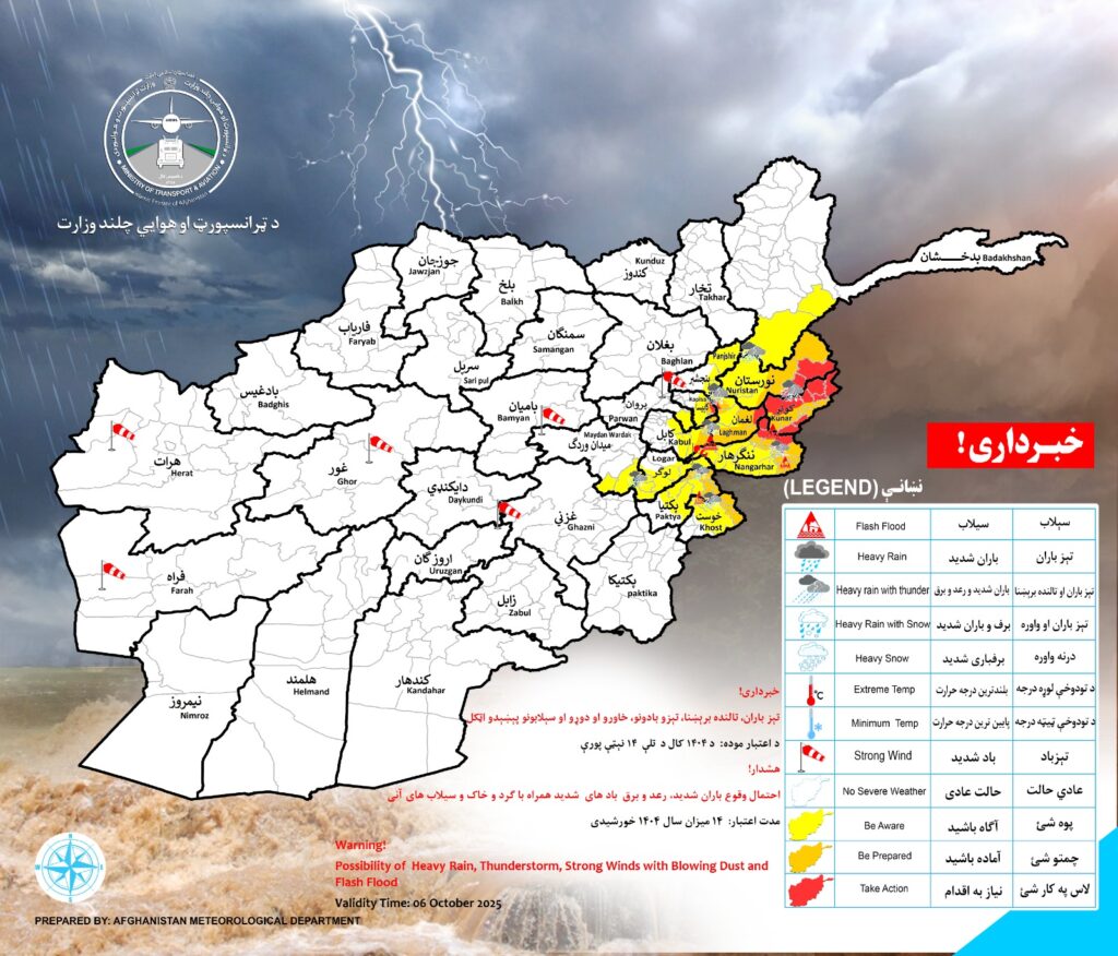 Warnings WARNING! Last updated Oct 5, 2025 Validity time: 06 October 2025 Possibility of heavy Rian, Thunderstorm, Strong winds with Blowing dust and Flash Flood for the following provinces: