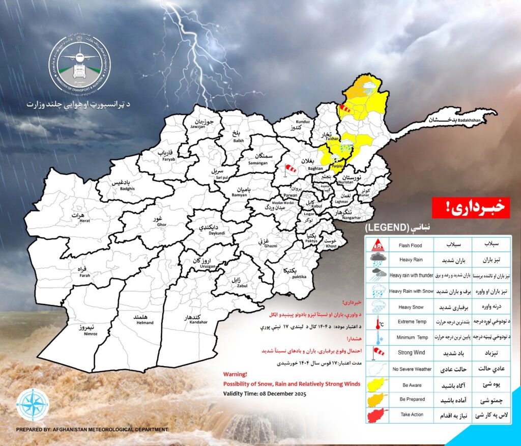 Warnings WARNING! Last updated Dec 7, 2025 Validity time: 08 December 2025 Possibility of snow, Rain and Relatively Strong wind for the following provinces: