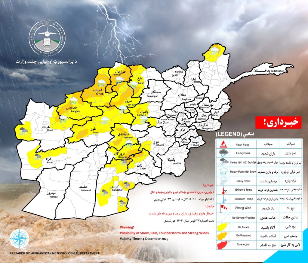 Warnings WARNING! Last updated Dec 13, 2025 Validity Time: 14 December 2025 Possibility of snow, Rain, Thunderstorm and Strong winds for the following Provinces: