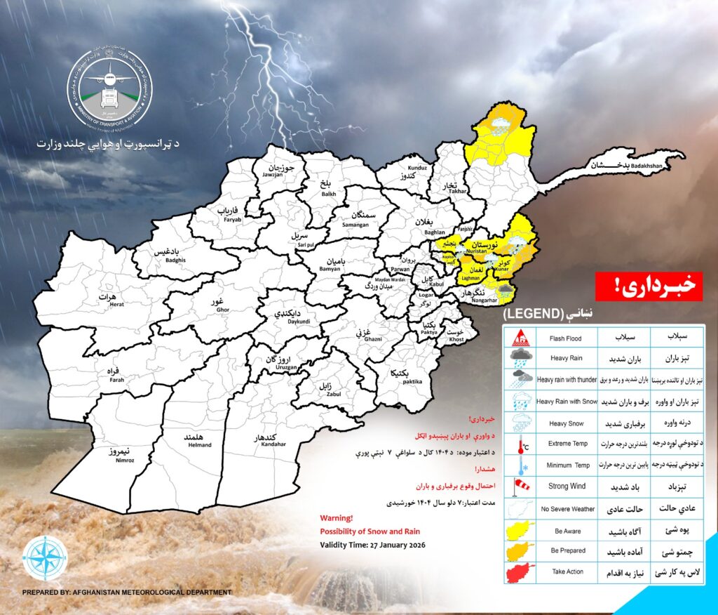 Warnings WARNING! Last updated Jan 26, 2026 Validity Time: 27 January 2026 Possibility of Snow and Rain for the following Provinces:
